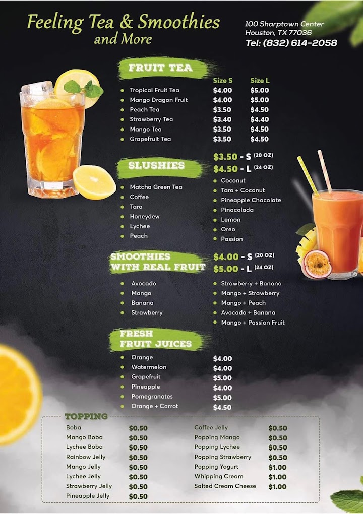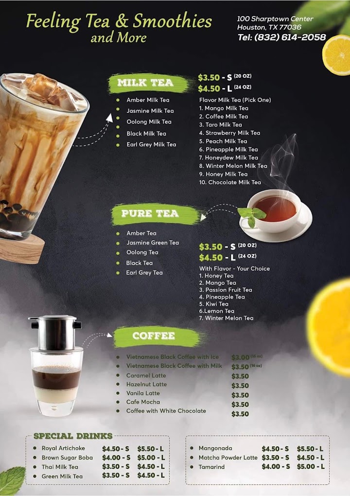 Step into Feeling Tea, your cozy corner for refreshing drinks and relaxing vibes. From handcrafted teas and rich coffee blends to flavorful smoothies, shakes, and more, every sip is a treat. Whether you're here to chill, recharge, or catch up with friends, Feeling Tea is your go-to spot for taste and comfort.